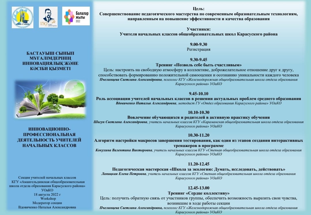 Ағымдағы жылдың 18 тамызында дәстүрлі тамыз педагогикалық конференциясы аясында бастауыш сынып мұғалімдерінің секциясы өтті. Оның барлық қатысушыларының қарқынды өзара іс-қимылын қамтамасыз ету мақсатында отырыс Workshop форматында өтті және білім берудің тиімділігі мен сапасын арттыруға бағытталған заманауи білім беру технологиялары бойынша педагогикалық шеберлікті жетілдіруге арналды.