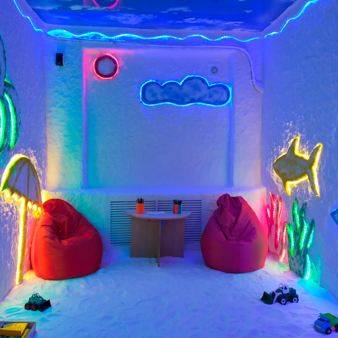 Тұз бөлмесі – қазіргі заманғы балабақшалардың міндетті атрибуты, Мұнда негізгі тұжырымдама денсаулық болып табылады. Тұз жабыны бөлмеде ылғалдылықтың, қысымның және температураның ең қолайлы деңгейін жасауға мүмкіндік береді. Тұз бөлмесіндегі атмосфераның иондық құрамы ерекше назар аударуға тұрарлық. Мұқият таңдалған химиялық элементтер жиынтығы адамның өнімділігін арттыруға көмектеседі және бактериялардың тіршілік ету мүмкіндігін бейтараптандырады. Айтпақшы, тұзды бөлмедегі процедуралардың тиімділігі теңіз курортында ұзақ уақыт болумен салыстыруға болады, ал жағдайдағы оң өзгерістер сауықтыру сессиялары басталғаннан бірнеше күн өткен соң байқалады. Ондағы ауа иондармен қаныққан, бұл иммунитетті нығайтады, тыныс алу жолдарының ауруларын емдеуге және жүйке жүйесіне пайдалы әсер етеді.