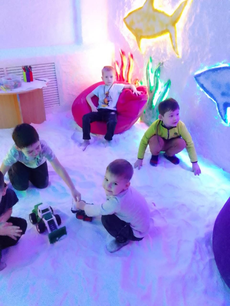 Енді «Нұр сәби» галотерапиясы тәрбиеленушілер үшін қызықты шытырман оқиғаға айналады. Мектеп жасына дейінгі балалардың назарын теремктің қызықты және ерекше ішкі ортасы аударады, онда барлығы ойын алаңымен жабдықталған. Бұл балаларға процедура кезінде жалықпауға мүмкіндік береді. Сонымен қатар, мұндай қаныққан галокамерада сабақ өткізуге болады. Жаңа спелеокомпанияда балалар сауықтыру сессиясына жалғыз емес, 7 адамнан тұратын компанияға келуі үшін бірнеше жұмсақ креслолар бар. Мұнда сіз ойыншықтармен ойнай аласыз, үстелдерде сурет сала аласыз және ыңғайлы және ыңғайлы пуф-сөмкеде демалуға болады. Бір сөзбен айтқанда, бәрі жағымды сауықтыру үшін.