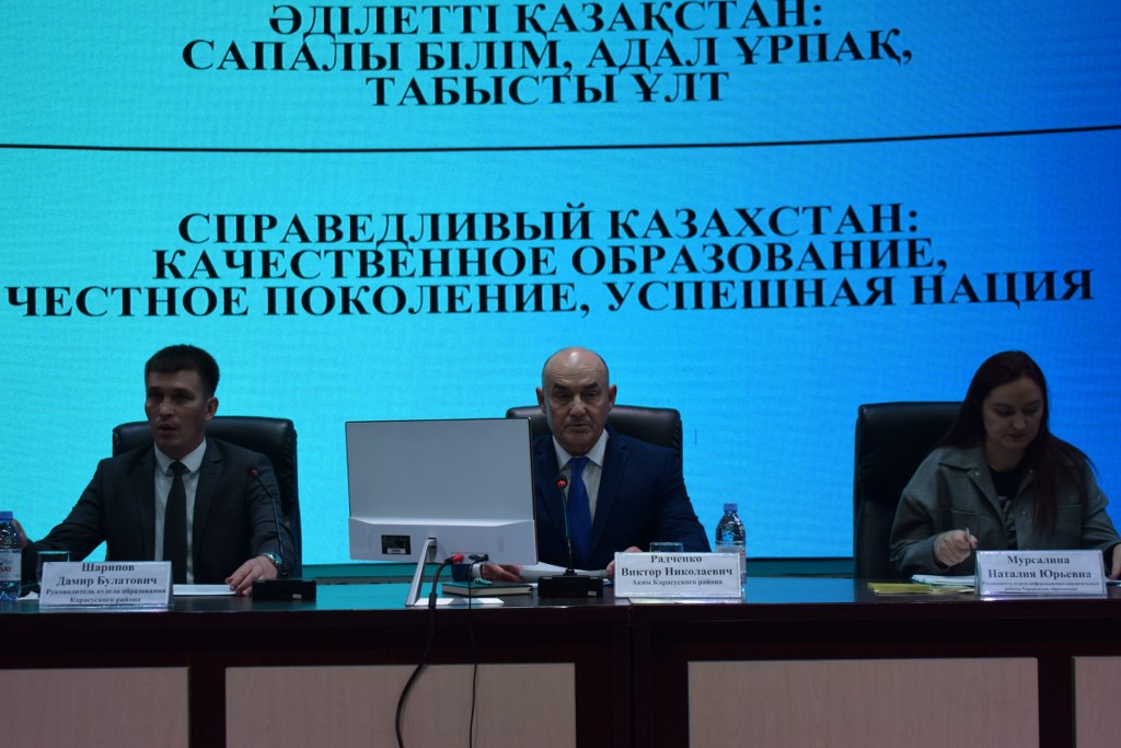 Қарасу ауданының әкімі В. Н.Радченконың төрағалығымен өткен кеңесте білім басқармасының өкілі (Н. Ю.Мурсалина) ауданның педагогикалық қоғамымен бірге (292 адам) жергілікті атқарушы органдардың, ата-аналар қоғамының, қоғамдық ұйымдардың, шаруашылық жүргізуші субъектілердің және бұқаралық ақпарат құралдарының өкілдерінен 40-қа жуық адам қатысты.
